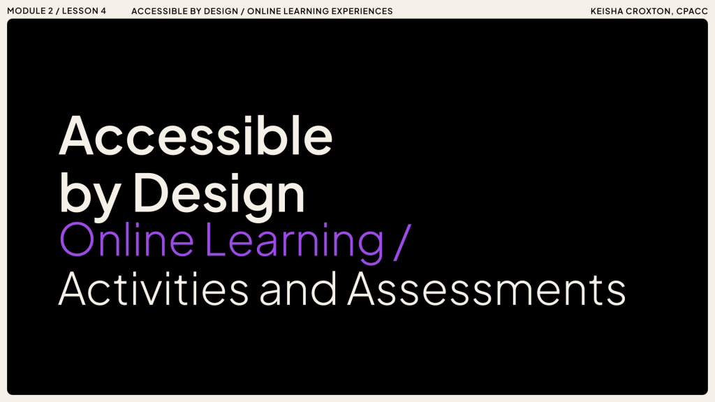 In this lesson, you’ll explore how to design meaningful assessments and learning activities that align with your course goals. You’ll learn about formative and summative strategies, how to map assessments to learning objectives, and how to ensure they’re accessible and flexible for all learners. You’ll also apply UDL principles to create more inclusive ways for learners to demonstrate understanding.