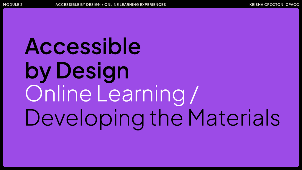 This module focuses on creating content that works for everyone. You’ll learn how to design accessible written materials, multimedia, and course structures that align with both WCAG guidelines and Universal Design for Learning (UDL). Each lesson explores how accessibility and inclusion go beyond legal compliance; they shape the learner experience. You’ll finish the module by creating an accessibility statement that outlines your commitment to inclusive learning.